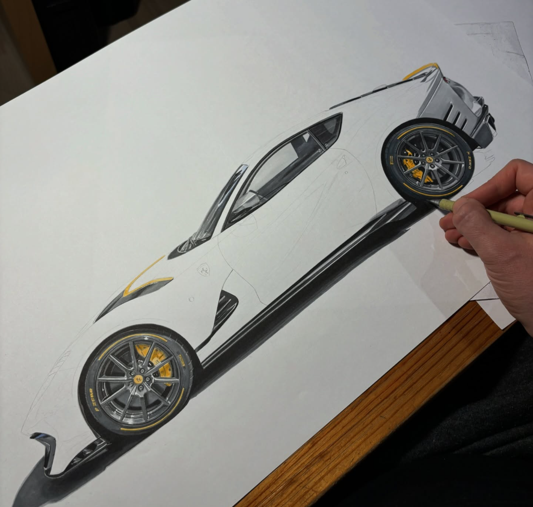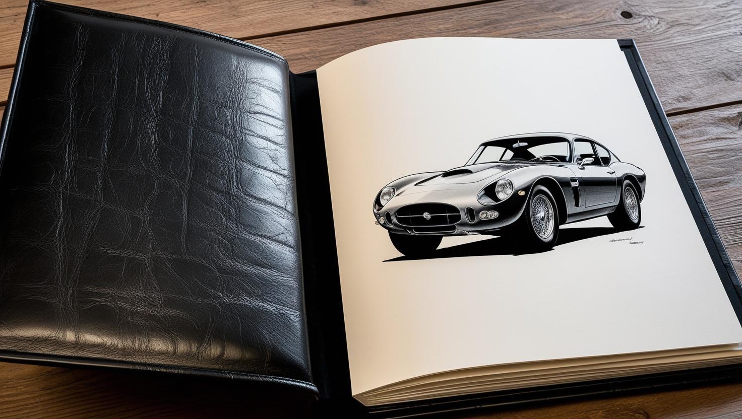 Et c’est à partir de là que je me suis décidé de concevoir et d’offrir cet album à mon père. Un album unique. Une authentique oeuvre d’art réalisée à la main. Un album qui recenserai toutes les voitures que nous avons eu la chance de conduire ensemble. Une album de famille en quelque sorte. Mais ce ne sont pas des photos qui siègeraient dans ce bel écrin mais bien de véritables oeuvres d’art réalisées par des artistes peintres et des dessinateurs.